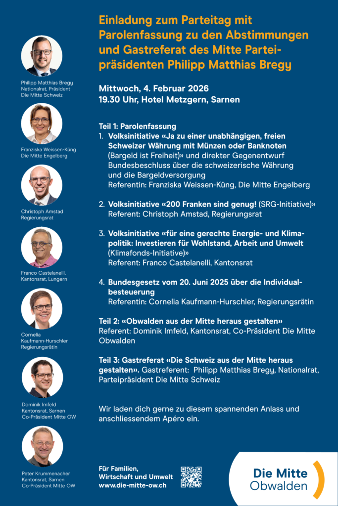 Wir freuen uns sehr, den nationalen Parteipräsidenten der Mitte Schweiz, Philipp Matthias Bregy, an unserer Februar-Tagung willkommen zu heissen.