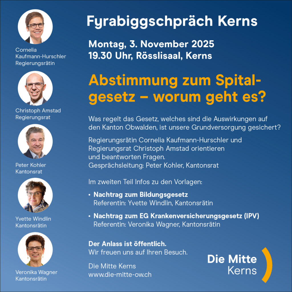 Die Mitte Kerns lädt herzlich zum Fyrabiggschpräch ein. Thema ist die Abstimmung zum Spitalgesetz: Was regelt das Gesetz, und wie wirkt es sich auf unsere Gesundheitsversorgung aus?
