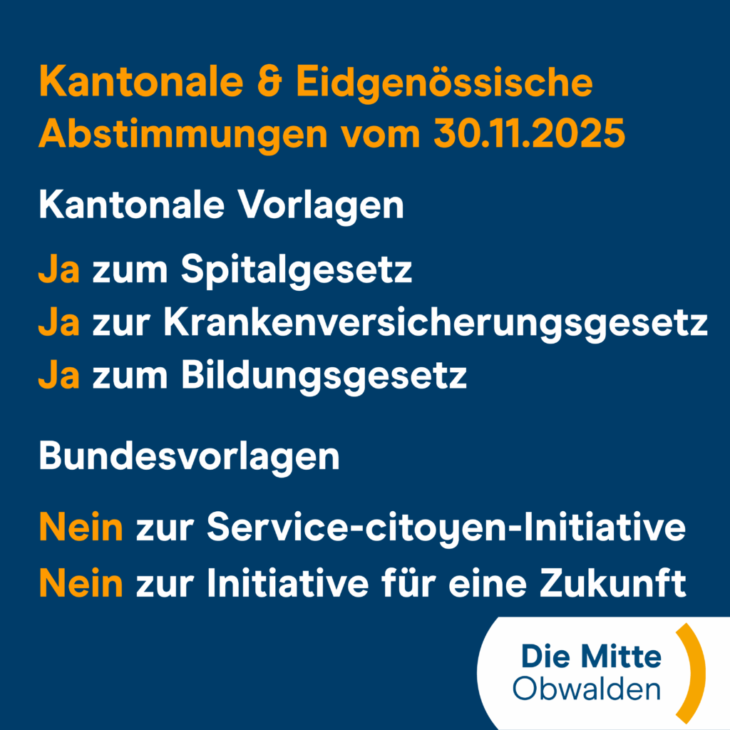 Die Mitte Obwalden empfiehlt für die Abstimmungen am 30. November 2025 folgende Parolen: