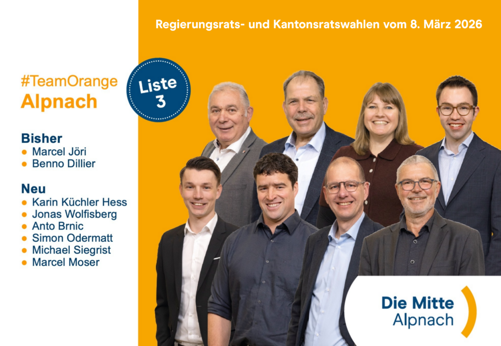 Hier finden Sie unsere 8 Kandidierenden der Mitte Alpnach für die Kantonsratswahlen am 08. März 2026. Wir danken Ihnen, wenn Sie die Liste der Mitte Alpnach unverändert wählen. WICHTIG: NUR EINE LISTE für die Kantonsratswahlen ins Abstimmungskuvert legen! Wenn Sie mehrere Listen ins Kuvert legen, sind Ihre Stimmen ungültig und vergessen Sie nicht Ihr Stimmcouvert zu unterschreiben!