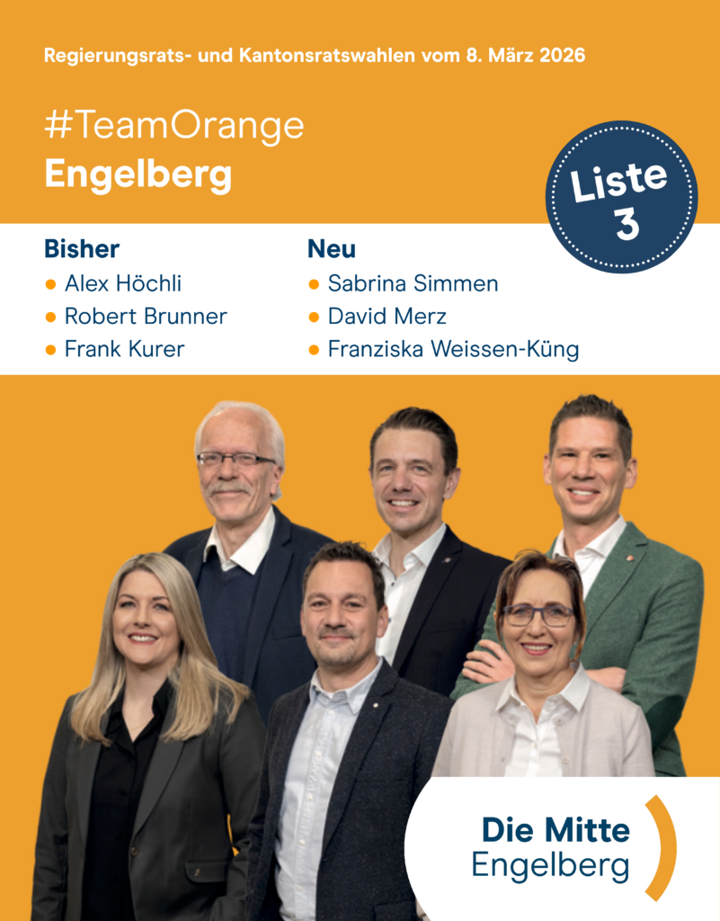 Hier finden Sie unsere 6 Kandidierenden der Mitte Engelberg für die Kantonsratswahlen am 08. März 2026. Wir danken Ihnen, wenn Sie die Liste der Mitte Engelberg unverändert wählen. WICHTIG: NUR EINE LISTE für die Kantonsratswahlen ins Abstimmungskuvert legen! Wenn Sie mehrere Listen ins Kuvert legen, sind Ihre Stimmen ungültig und vergessen Sie nicht Ihr Stimmcouvert zu unterschreiben!